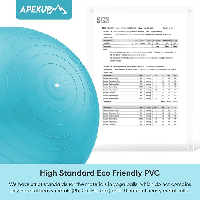 - [SAFE AND ANTI BURST] APEXUP Exercise ball is made of high-quality, eco-friendly PVC material, which meets stringent safety standards. It's non-toxic, odorless, and free from harmful heavy metals. With an anti-burst honeycomb structure, it ensures durability and safety during your workouts