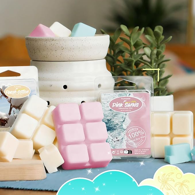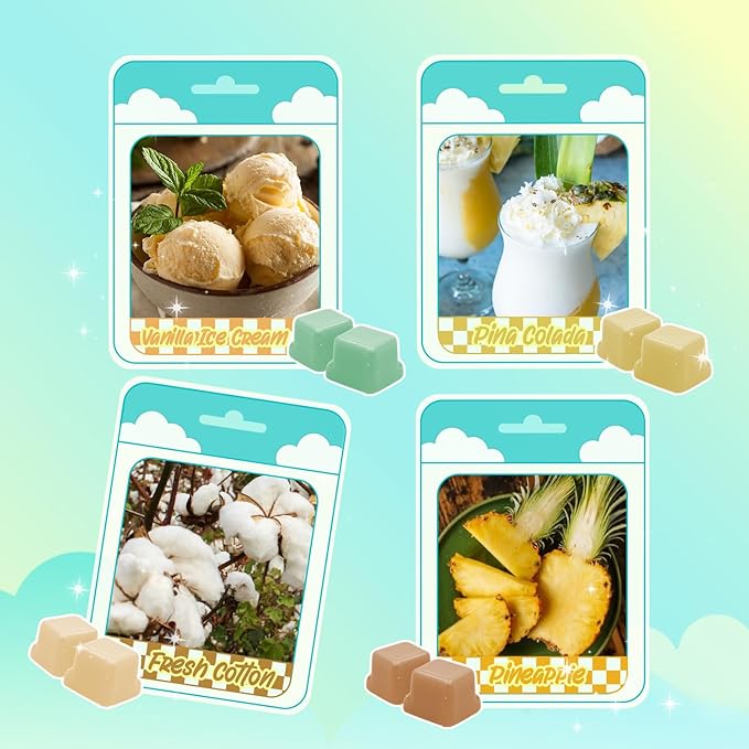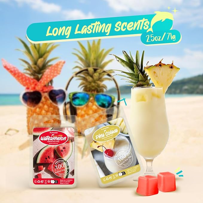 - Summer Wax Block Set for Every Mood: Transform your space with our summer wax block set featuring 8 unique and refreshing scent notes: Sea Breeze, Coconut, Coconut Grove, Pink Beach, Pineapple, Watermelon, Vanilla Ice Cream, and Fresh Cotton. These carefully crafted fragrances are designed to create a calming and invigorating atmosphere, filling your home with the perfect summerscents. Each scent offers its own unique scented experience, ideal for a variety of moods and occasions.