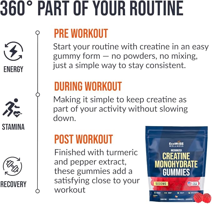 EcoWise Wellness Creatine Monohydrate Gummies 5g, Chewables Gummies for Men & Women, Gluten-Free, Sugar Free, Strawberry