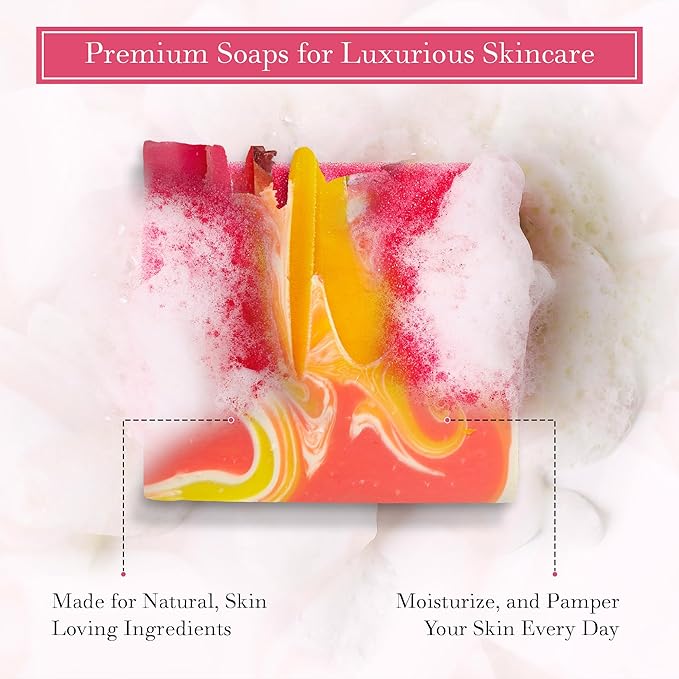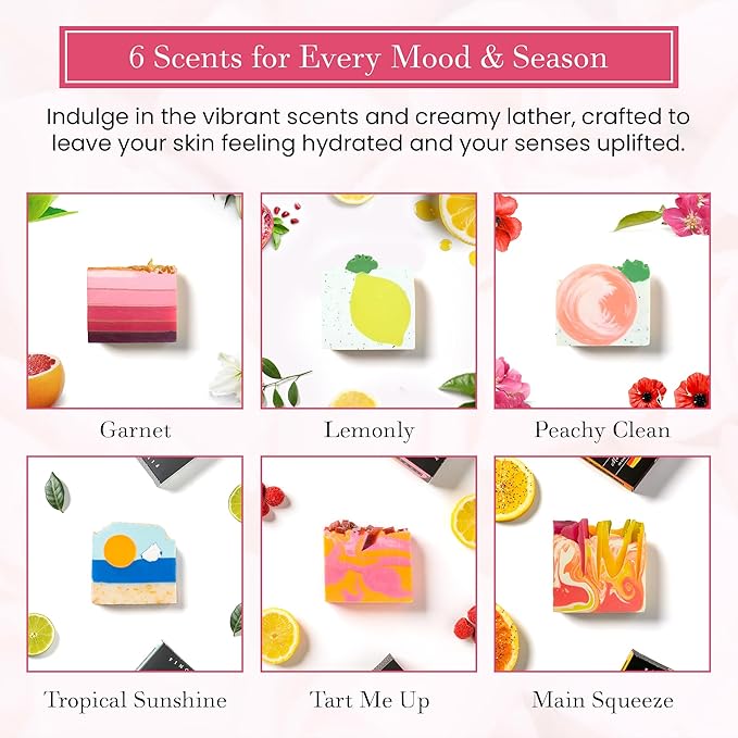 - ๐๐ฑ๐ฉ๐๐ซ๐ข๐๐ง๐๐ ๐๐๐๐ง๐ญ๐ฌ ๐จ๐ ๐๐ฉ๐ซ๐ข๐ง๐ ๐ข๐ง ๐๐ฏ๐๐ซ๐ฒ ๐๐๐ซ: The Body Soap SPRING Pack features six invigorating scents, including Lemonly, Garnet, and Tropical Sunshine. These natural bar soap options evoke refreshing summer memories while adding a touch of elegance to your self-care routine. They are perfect for those who appreciate vibrant and aromatic bathing essentials.