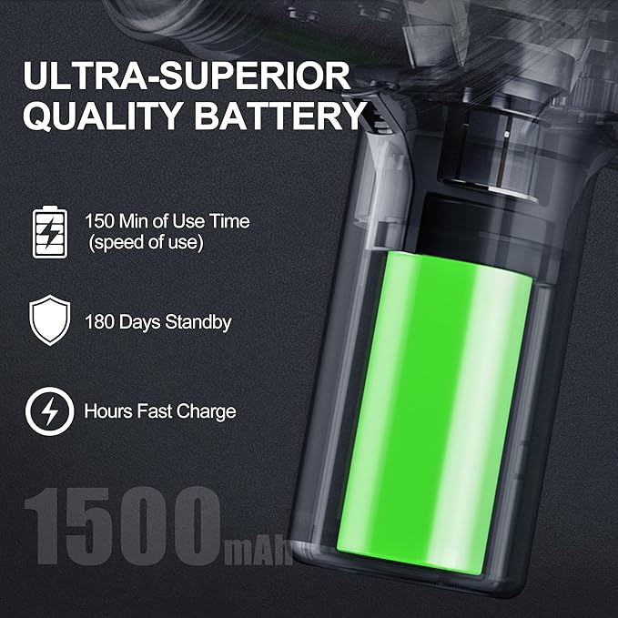 - 【Large battery capacity】Powered by high-quality, high-density 1500mAh battery, charged via USB-C. The use time depends on the selected speed. Press once to display the remaining power, and press for 2 seconds to start. For safety reasons, there is an automatic shutdown function after 15 minutes.