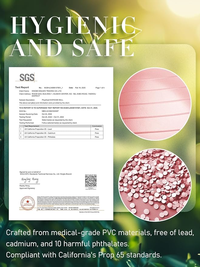 • 🤍𝐇𝐲𝐠𝐢𝐞𝐧𝐢𝐜 𝐚𝐧𝐝 𝐒𝐚𝐟𝐞- A gym ball, or also known as fitness ball, physio ball, yoga ball or balance ball is normally made of PVC. We upgraded the grade of PVC of our gym ball to a 16p-free level. It is free from phthalates, latex, BPA and other leading harmful chemicals, thus offering a safe and gentle support for exercise, seat and pregnancy.