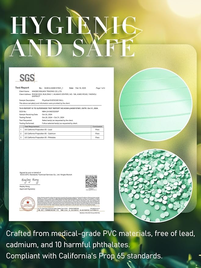 • 🤍𝐇𝐲𝐠𝐢𝐞𝐧𝐢𝐜 𝐚𝐧𝐝 𝐒𝐚𝐟𝐞- A gym ball, or also known as fitness ball, physio ball, yoga ball or balance ball is normally made of PVC. We upgraded the grade of PVC of our gym ball to a 16p-free level. It is free from phthalates, latex, BPA and other leading harmful chemicals, thus offering a safe and gentle support for exercise, seat and pregnancy.