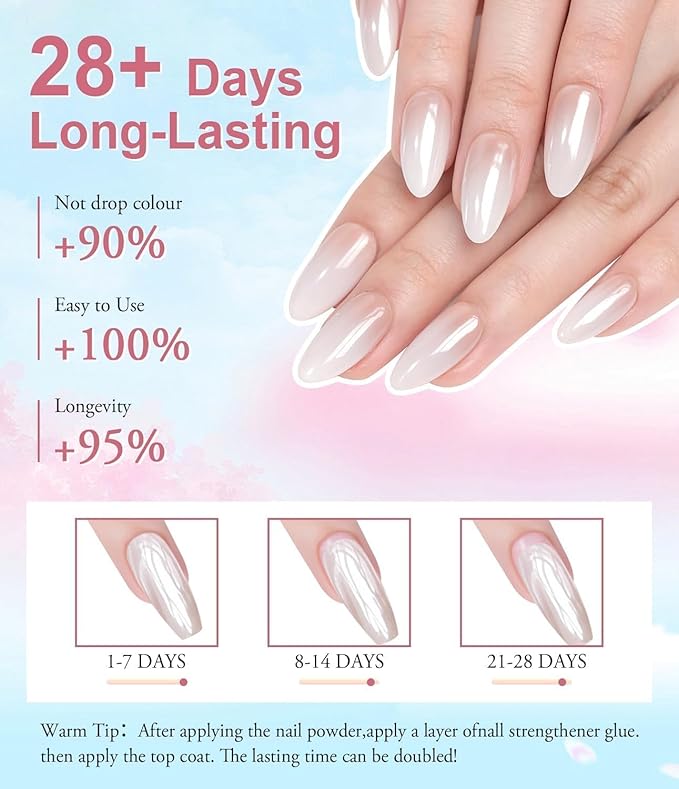 - Distinctive Pearl Chrome Powder: Our powder is a newly upgraded super transparent pearl chrome nail powder. The brightness and shiny is better than the old version, this powder is non-toxic, harmless, especially durable, vegan and harmless. Elevate your nail art with our superior quality chrome powder set that effortlessly creates mesmerizing mermaid chrome effects.