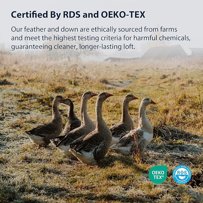- Hypo-Allergenic: One of the most important and expensive components of our luxury down bedding is the cleaning process. Our bed pillow's feathers and down is ethically sourced and certified by RDS and OEKO-TEX Standard 100 and multiple washed to guarantee a cleaner, longer-lasting loft.