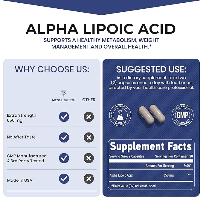 - High-Potency Alpha Lipoic Acid: Each serving provides 650mg of premium Alpha Lipoic Acid, designed to complement your daily wellness routine with antioxidant and metabolic support.