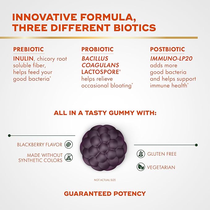 - GREAT TASTING BLACKBERRY FLAVOR: Align Probiotic 3-in-1 Biotic Gummies have a delicious blackberry flavor that you can look forward to every day.