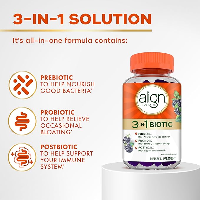 - HELPS RELIEVE OCCASIONAL BLOATING*: Align Probiotic 3-in-1 Biotic Gummies contain a probiotic called Lactospore to help support a healthy digestive system and soothe occasional bloating.*