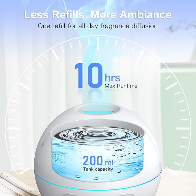- 200ml Oil Diffuser for 10H Continuous Fragrance: Designed to fit neatly on any desk without taking up too much space. Fill it once for up to 10 hours of enduring aroma, making it suitable for long work sessions or cozy evenings at home. Features an auto-shutoff function for safety when water runs low