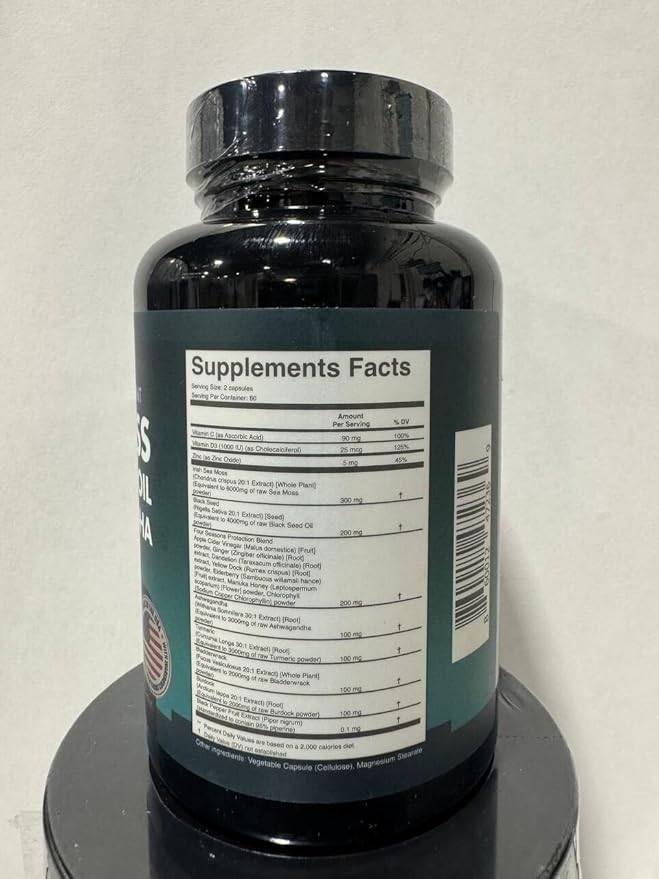 Irish Sea Moss Black Seed Oil Ashwagandha Ginger, 20,000mg Capsules, Seamoss Black Seed Oil Ashwagandha Burdock Root, All in One Supplement, 120 Capsules