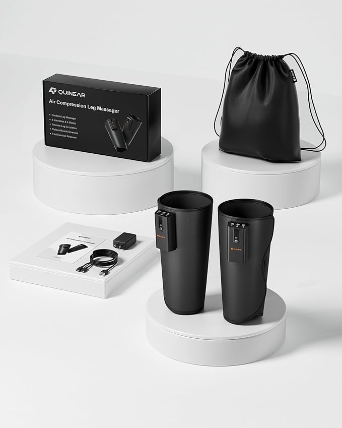 - 2500mAh Long-Lasting Battery & Fast USB-C Charging - QUINEAR leg compression massager build in 2500mAh Battery, enjoy 2-3 hours of cordless relaxation per charge (USB-C included). Perfect for travel, office breaks, or post-workout recovery—no cords, no limits. Rechargeable design saves costs vs. disposable battery models.