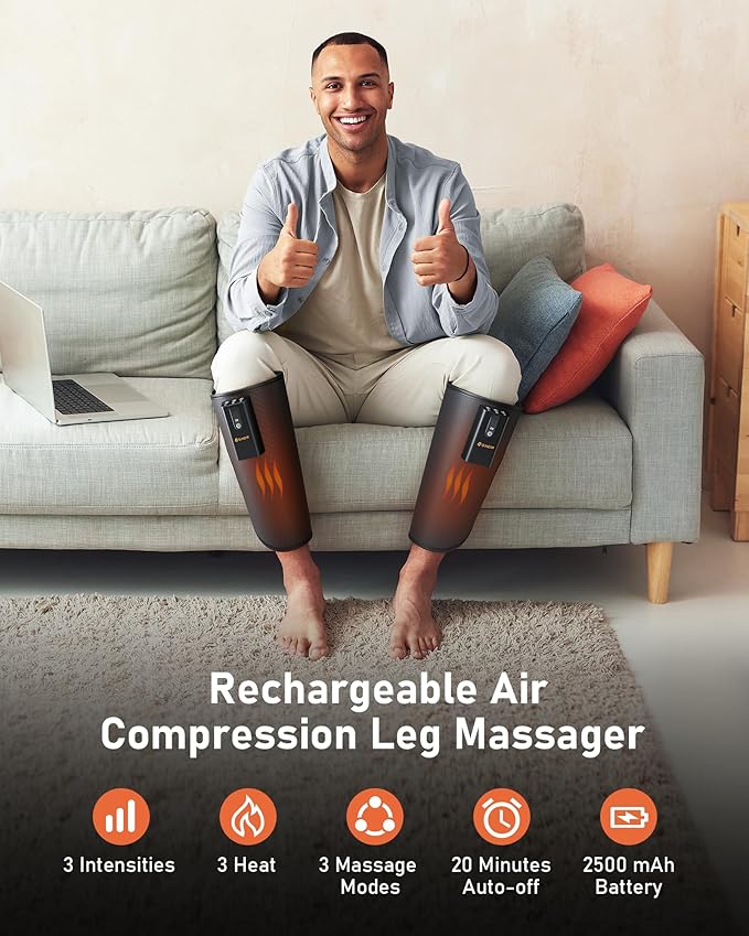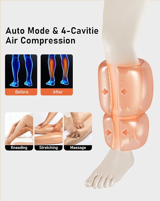 - 3-Level Intensities Air Compression & 3 Massage Modes - Experience targeted pain relief and muscle recovery with 3 adjustable intensities and 3 modes (Sequence/Circulation/Auto). The advanced air compression technology mimics professional kneading, effectively reducing swelling, fatigue, and leg muscle soreness—ideal for athletes, runners, and office worker.