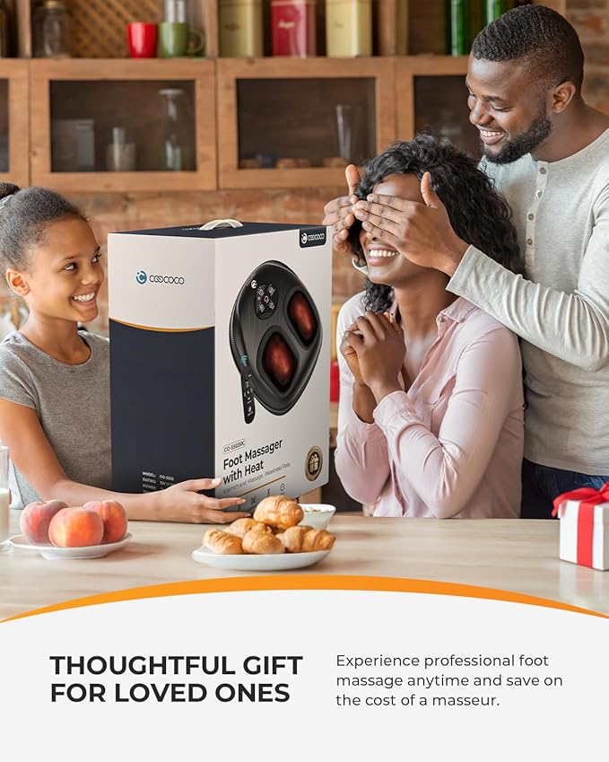 - 2025 Upgraded Shiatsu Foot Massager: CooCoCo foot massage machine features 3 heating levels, 3 massage modes, and 5 compression intensities, combining rolling, kneading, heat, and compression for a fully personalized experience. Designed to target key strain points and foot zones, it enhances comfort by 40% and helps relieve daily foot discomfort.