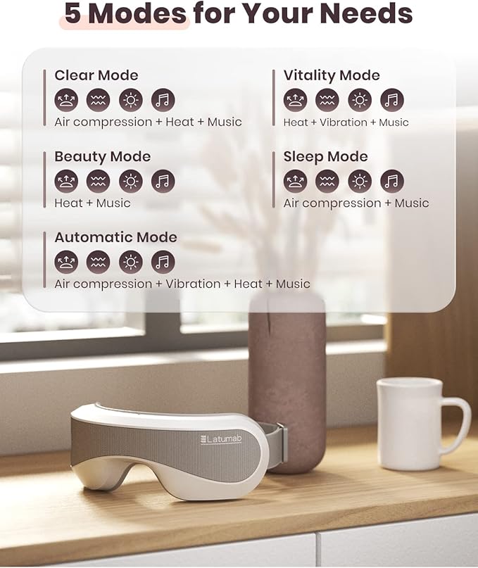 - 5 Different Modes for Your Needs: The eye massager features a unique combination of heat, compression, and vibration to take your tired eyes on a relaxing journey. With 5 different massage modes, you can mix and match different sensory inputs that best suit your needs