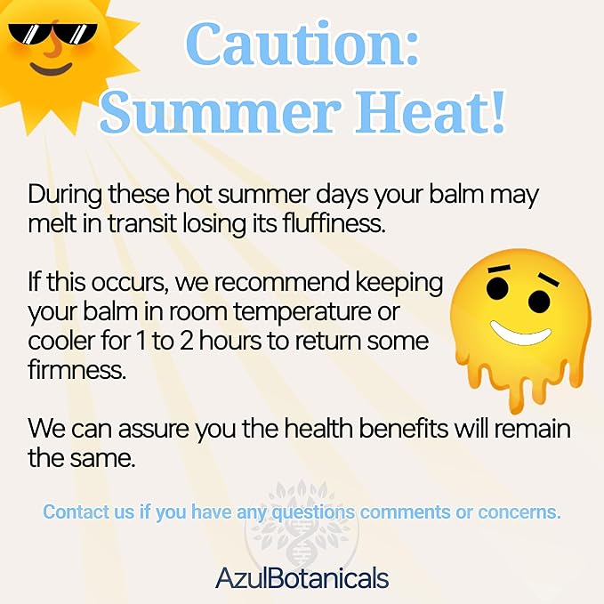 - CAUTION SUMMER HEAT: Please note, due to extreme heat our whipped balms may melt in transit, losing some of it's fluffy texture. If this occurs, we recommend you keep your balm at room temperature or a cooler location for 1-2 hours to return it's firmness. We can assure you that the benefits of this product will remain the same.