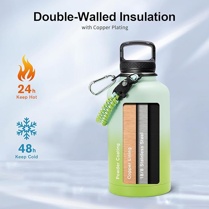 - Double Wall Insulation: Vacuum Double wall stainless steel water bottle with copper plating maxes its keep water ice cold long time , allowing you to enjoy your favorite flavor in the long run.Ice retention longer,you can always get cold water.Good ideal for outdoor sports, office, gym and more!