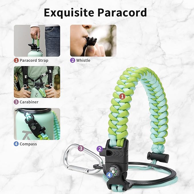 - Full-function Paracord Handle: Brilliant paracord of matching colors bring out the bottle with a touch of youthful vibe. Compact compass and handy carabiner make the bottle the ideal survival kit for expeditions in the wild