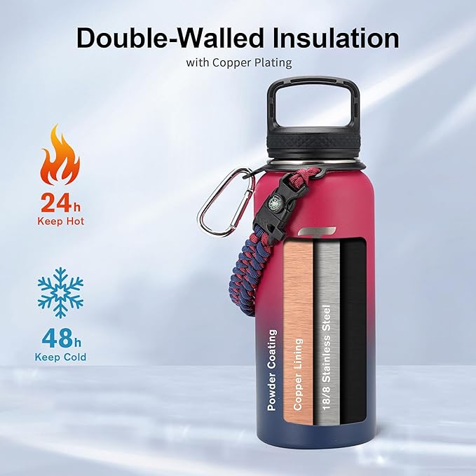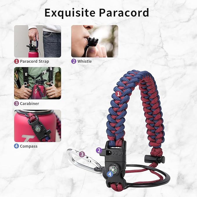 - Full-function Paracord Handle: 32 ounce water bottle come with paracord handle the brilliant paracord of matching colors bring out the bottle with a touch of youthful vibe. Compact compass and handy carabiner make the bottle the ideal survival kit for expeditions in the wild.