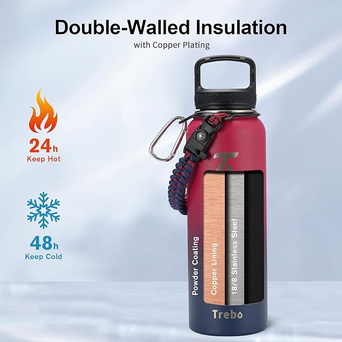 - A Full Pack: Trebo water bottles insulated included with 3 lids, 1 survival paracord, 2 straws, 1 straw brush, this 40 oz insulated water bottle is fully accessorized to handle any tricky situations. Our friendly customer care are always happy to help.