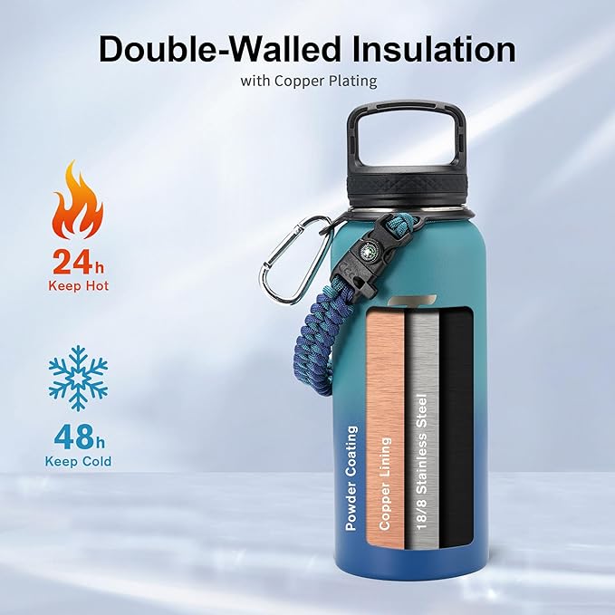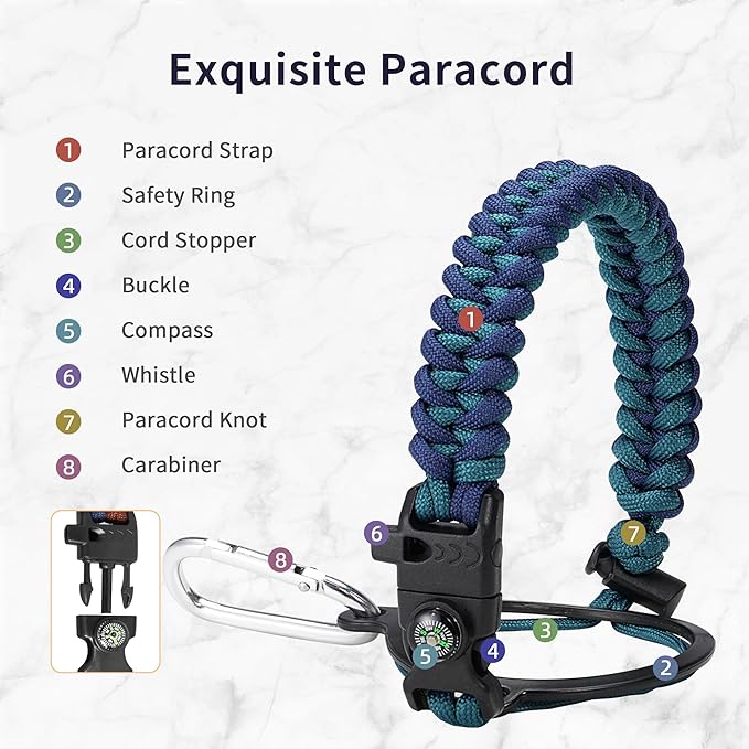 - Full-function Paracord Handle: 32 ounce water bottle come with paracord handle the brilliant paracord of matching colors bring out the bottle with a touch of youthful vibe. Compact compass and handy carabiner make the bottle the ideal survival kit for expeditions in the wild.