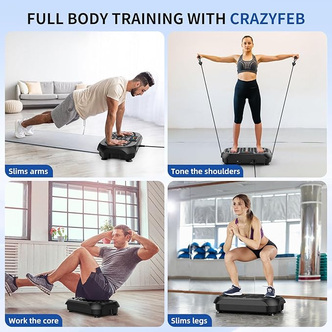 - 【Brand-new design】 - Our vibration plate uses a brand-new motor, which ensures that it has sufficient power and can achieve 120 vibration speeds. The anti-slip coating design and impact-resistant ABS shell ensure the service life and protect the motor. The four anti-slip suction cups at the bottom ensure the stability of the power plate, prevent sliding and reduce exercise noise. We also provide two tension bands to meet users' more training requirements.