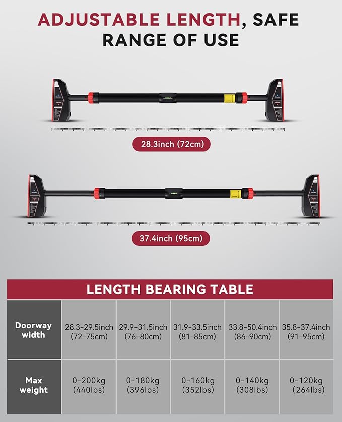 - 【Adjustable Width & Comfortable Grip】Featuring an adjustable width from 72cm to 95cm (28.3in-37.4in), this Pull-up Bar for Doorway accommodates various door frames while ensuring a snug fit. The high-quality EVA foam handles provide superior comfort and grip, allowing you to focus on your workout without discomfort or slipping.