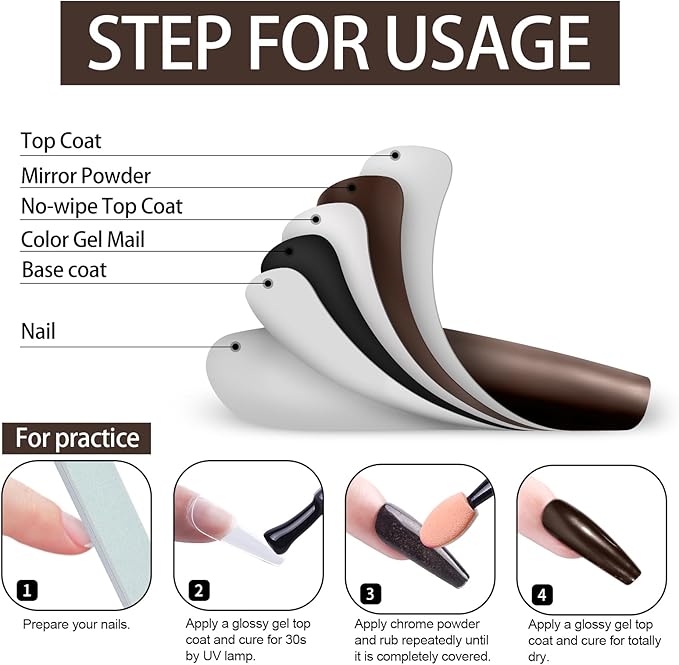 - The Scope Of Application:All chrome powders should only be applied to glossy No wipe top coat to embellish Nail-Polishes color. Otherwise it is unusable, it can't be applied directly to the nail, and it can't be applied directly to the skin. Artdone chrome powder can be applied on UV gel nails, acrylic nails or false nail tips. You can use them very easily