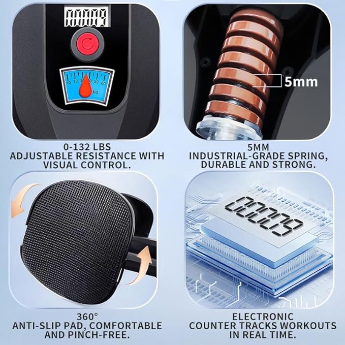 - Adjustable Resistance from 10-60KG with Visible Pressure Gauge Customize your workout intensity with adjustable resistance ranging from 10 to 60KG, monitored by a clear pressure gauge for precise control.