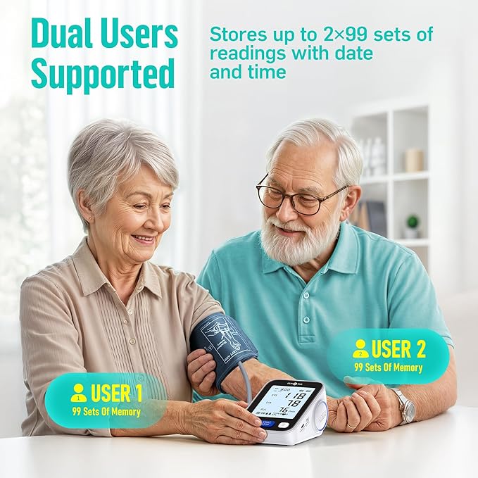 - [One Monitor, Two Hearts] Runstar Blood Pressure Monitor is perfect for home use. It supports 2 users and saves 99 measurement readings with date and time for each user in its internal memory. This