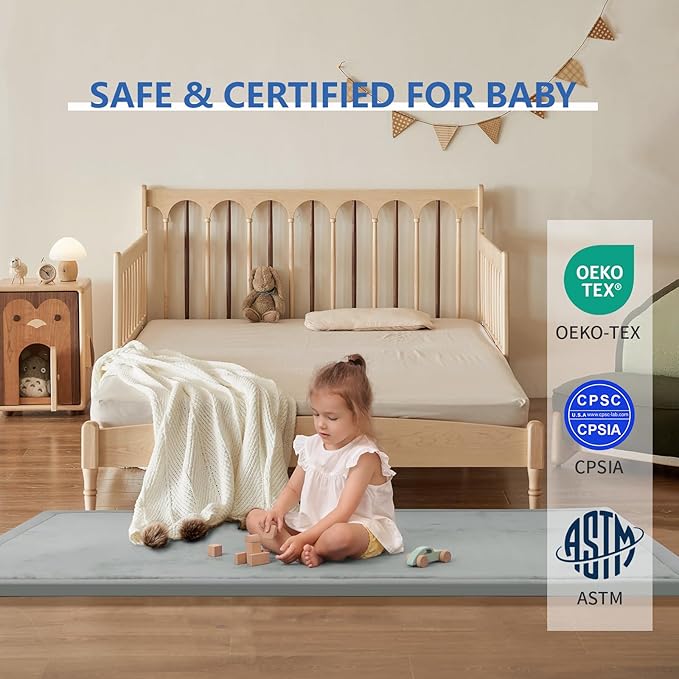 - 【Safe & Certified for Babies】Our baby play mat is designed with safety as the top priority. Certified by OEKO-TEX fabric standards and tested to meet CPSIA and ASTM requirements, this kids play mat is free from harmful substances. Parents can choose with confidence, knowing their little ones are playing on a non-toxic, ultra-soft crawling mat.