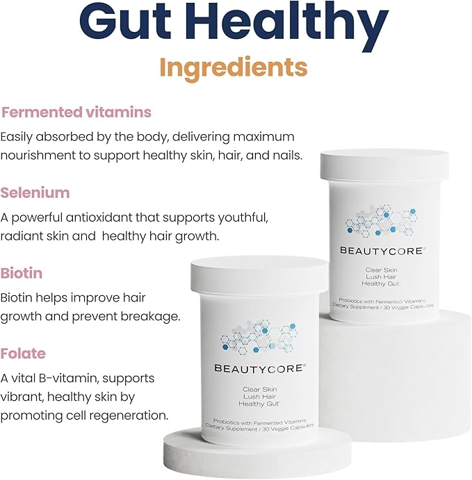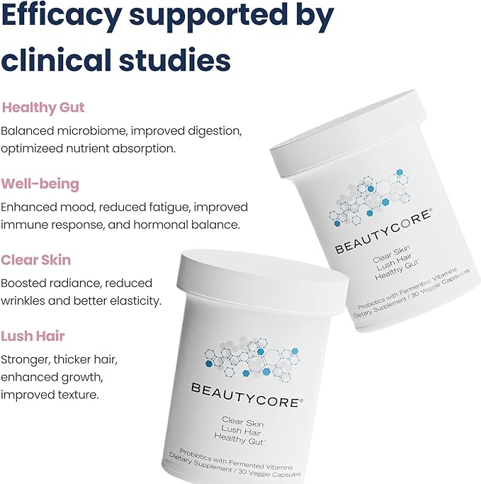 - BEAUTY FROM THE INSIDE OUT: Beautycore’s formula focuses on gut health as the foundation of true beauty. Combining 20 billion CFU probiotics with fermented vitamins, it balances the gut microbiome to promote clearer skin and stronger hair & nails, while supporting bloating relief for women. This is the ultimate beauty supplement to nourish your body from the inside out.