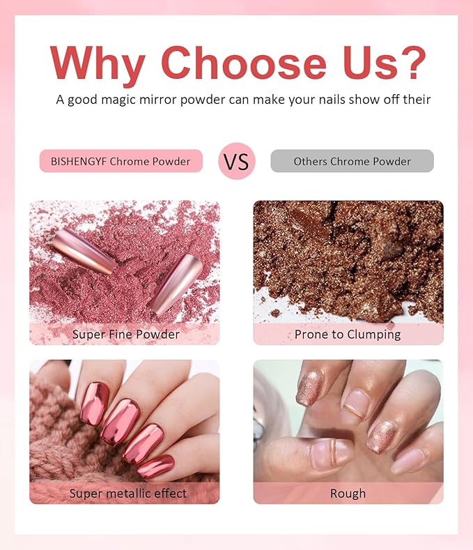 - Upgrade Nail Glitter Powder : BISHENGYF chrome powder for nails is made of synthetic resin and non-toxic. The aurora chrome nail powder is fine with attractive luste. Our crome nail powder has a great holographic and pearlescent effect.