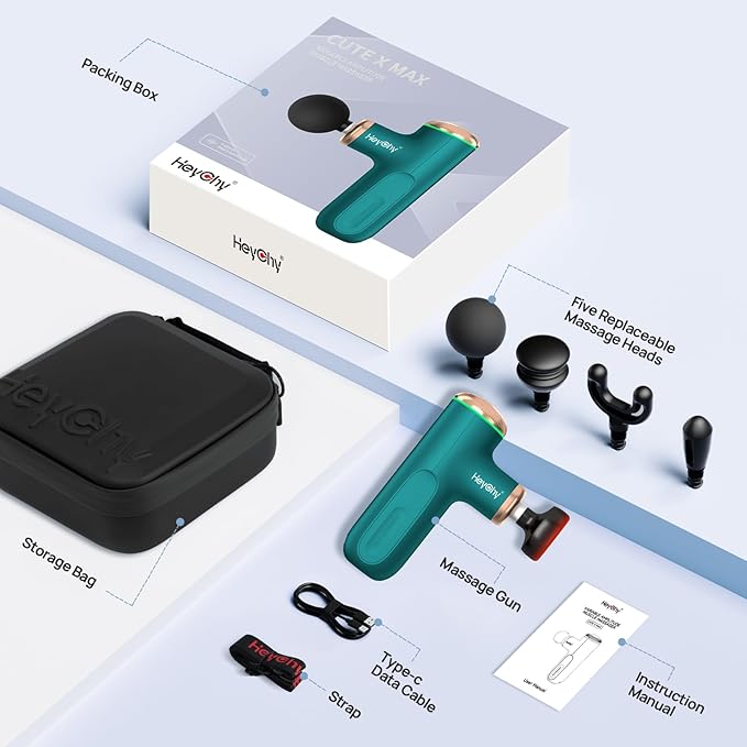 - 【5 Interchangeable Massage Heads】The heated head (50°C/140°F) can promote blood circulation and relieve stiffness 30% faster (compared to non-heating guns). Includes 4 interchangeable heads (ball head, flat head, fork head, bullet head) with a rotation speed of 800-3200 RPM for targeted relief.