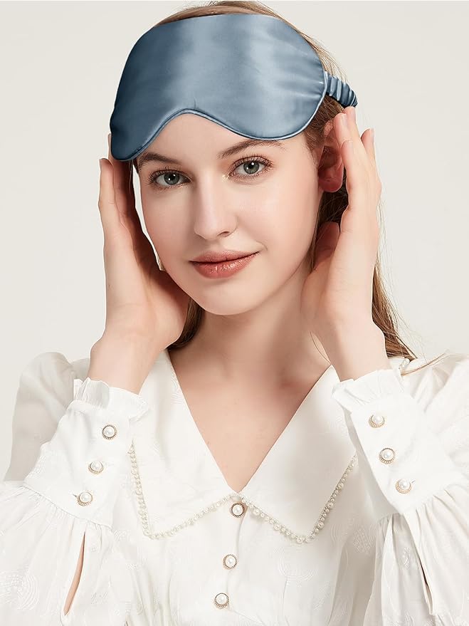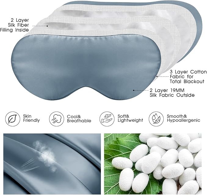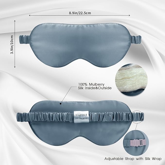 Mulberry Silk Blackout Adjustable Sleep Eye Mask for Men/Women Travel Plane,Ash Blue
