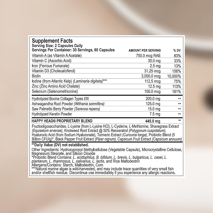 - Developed and formulated by leading dermatologists and hair restoration experts, Happy Head hair growth vitamins are formulated with comprehensive, science-backed ingredients including Vitamins A, C and D, ashwagandha, saw palmetto, types I and III hydrogen bovine collagen, biotin and keratin as well as probiotics for maximum absorption*