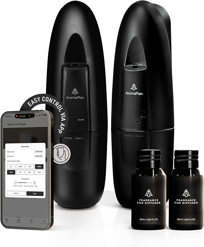- TWO LUXURIOUS WATERLESS PLUG-IN DIFFUSER WITH 2 FRAGRANCES – The AromaPlan Plug-In Diffuser uses advanced NT10x nanotechnology to transform liquid fragrance into dry, vaporous microparticles, evenly scenting spaces up to 500 sq ft without water or oily residue. This set includes 2 Plug Ins + 2 bestselling 25ml fragrances—Dubai & 24 Knights—delivering fresh, invigorating scents.
