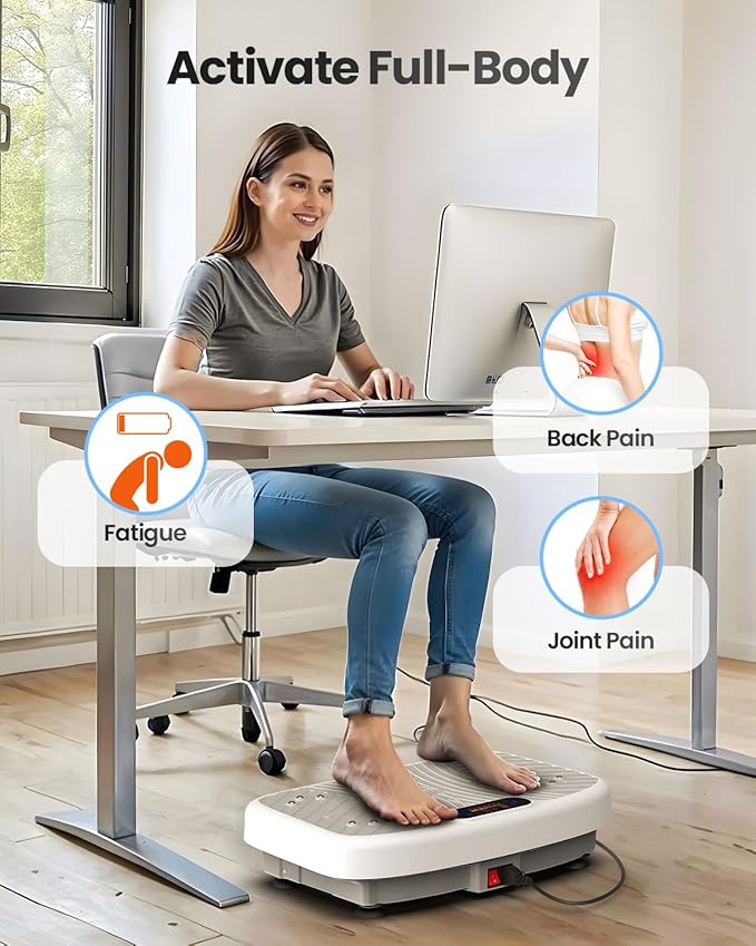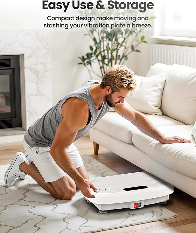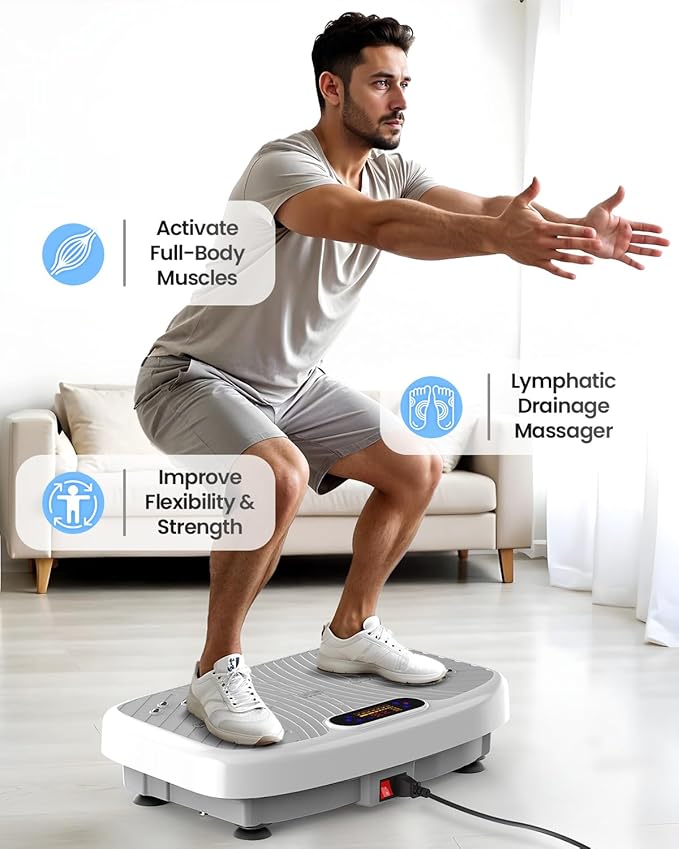 - Safe and Efficient: A vibration plate for lymphatic drainage is more friendly on the knees and joints, awakening muscles throughout, improving blood circulation, and boosting metabolism. Compared to running vibration plate exercises can protect bones, relieve chronic pain, and repair old injuries. Its vibrations also support muscle strength, lymphatic drainage, and bone density – a holistic approach to wellness from home.
