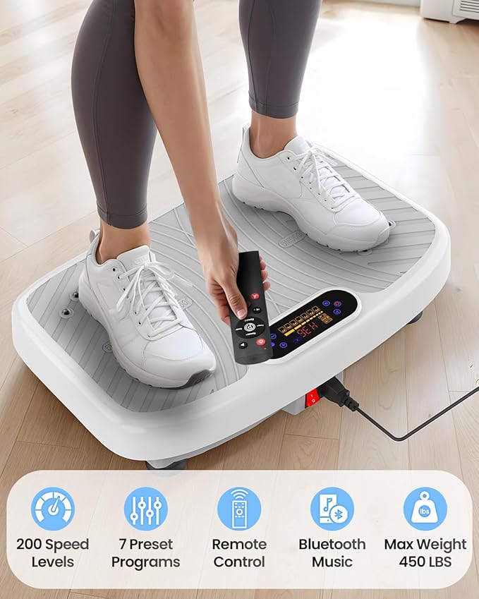 - Effective and Convenient: This vibrating plate exercise machine features 1-200 adjustable vibration speed and 2 resistance bands for full-body workouts. With multiple exercise modes, it supports various vibration exercises to target different muscle groups. Only 10 minutes daily to boost metabolism, strengthen bones, and relieve stress while shaping your body.