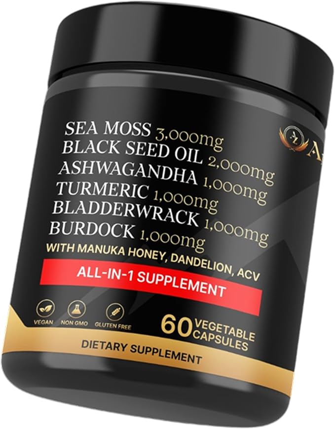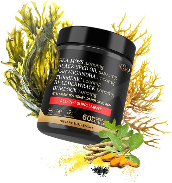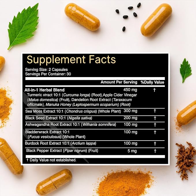 Sea Moss Capsules - Health Supplements - True Seamoss Black Seed Oil Ashwagandha Burdock Root, Tumeric Supplement with Manuka Honey, Dandelion Root ACV - 60 Capsules