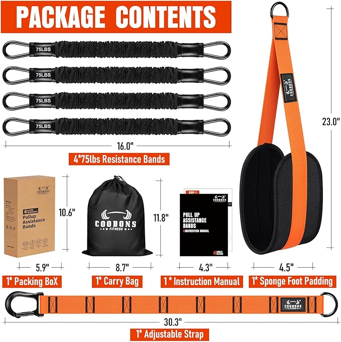 - Comprehensive Pull Up Assist Bands Kit: This kit includes everything you need: 4 elastic pull up bands assistance bands, an adjustable nylon strap, a sturdy foot strap, a clear installation manual, and a portable travel pouch. Designed with safety in mind, the foot strap provides stable support and reduces strain during pull-ups. Compact and convenient, this complete set is ideal for enhancing your home gym or taking your workout on the go.