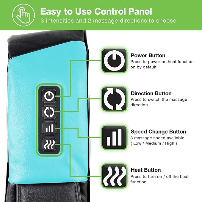 - 【Simple and easy to use premium massager】Simply plug it in and press start. The two-way kneading nodes provide ultimate comfort and a pleasant massage experience. There is also an optional heating feature. This massager for neck and back is crafted from durable, high-quality materials. The mesh dust-resistant cloth prevents accumulation of dust, and the high-grade PU leather allows for easy cleaning with a simple wipe.