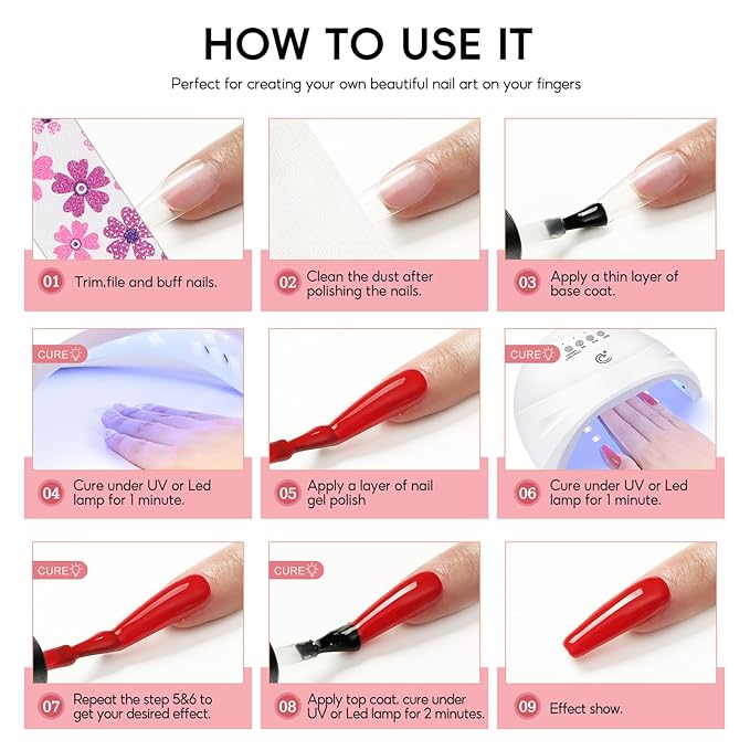- ❤Different Top Coats Effect: This gel nail kit includes 4 kinds different top coat ( Glossy, Matte, Golden glitter, Silver glitter ). You can choose different top coat to achieve different nail art effects and increase the richness of nail art. Design your unique style in this charming season.