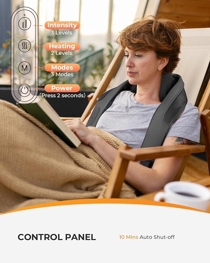 - 6D Human-Like Kneading & Wider Ergonomic Design: Feel the relief of a professional massage hands! CooCoCo neck massager mimic real-life Shiatsu techniques—gentle kneading and rhythmic stretching that target tight neck, shoulder, and upper back muscles. Designed with a Larger massage zone, it comfortably fits all body types without pinching or pressure points. No more awkward squeezing—just smooth, deep-tissue relaxation that hugs your curves like a skilled masseuse. Masajeador de espalda y cuello.