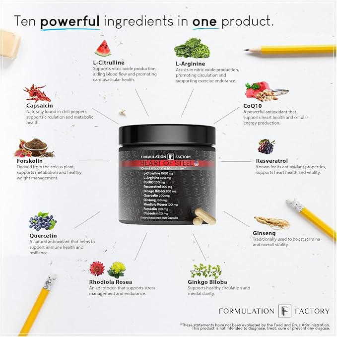 - 10-IN-1 METABOLIC MAXIMIZER – L-Citrulline, L-Arginine, CoQ10, Resveratrol, Ginseng, Ginkgo Biloba, Rhodiola, Quercetin, Forskolin, Capsaicin. A powerhouse blend for circulation and stamina.