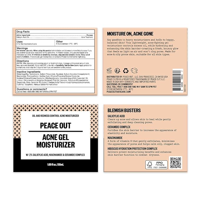 - Peace Out Skincare Acne Gel Moisturizer: A daily face moisturizer that hydrates without clogging pores. This lightweight, non-greasy formula controls excess oil and shine, leaving skin feeling fresh, balanced, and smooth throughout the day