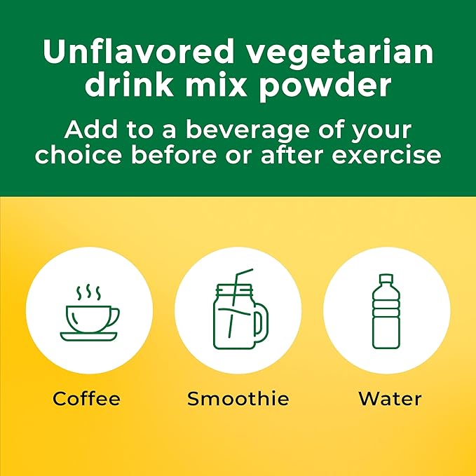 - Unflavored, vegetarian and gluten free drink mix powder with no artificial colors and no preservatives