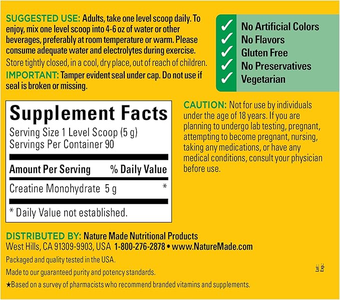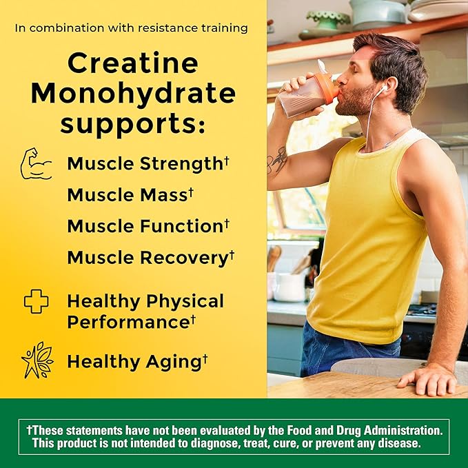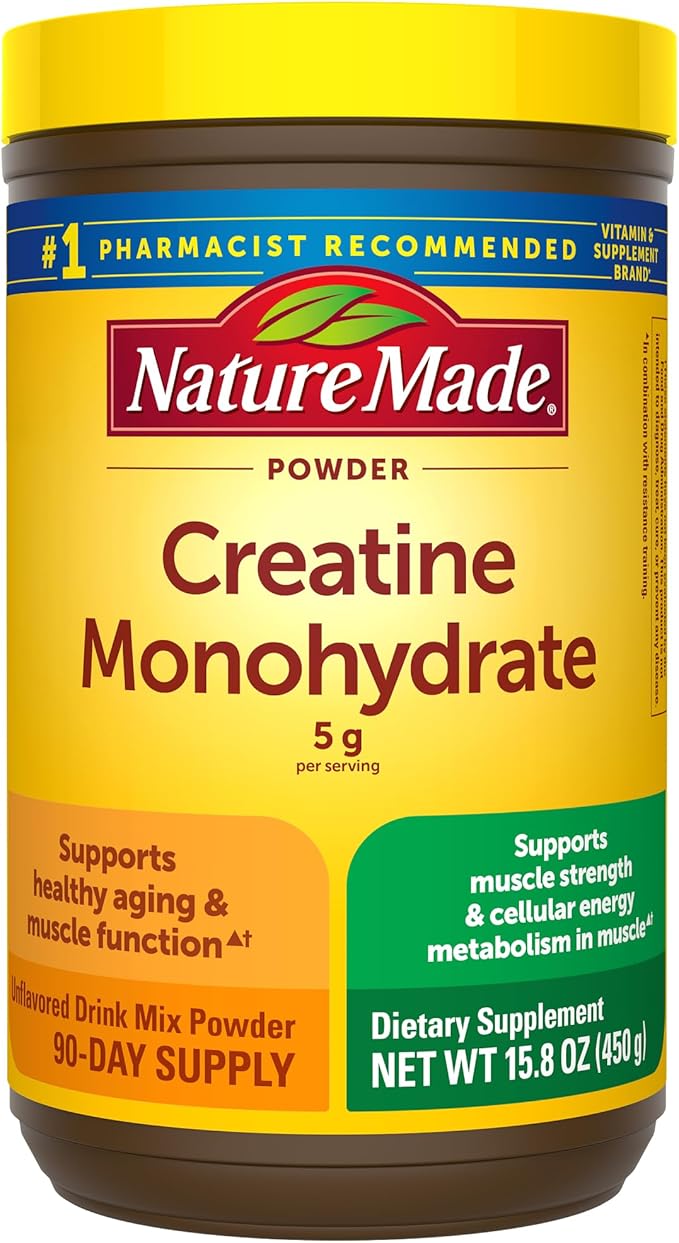 - Muscle support supplement: contains a 90-day supply of Nature Made Creatine Monohydrate Powder Drink Mix