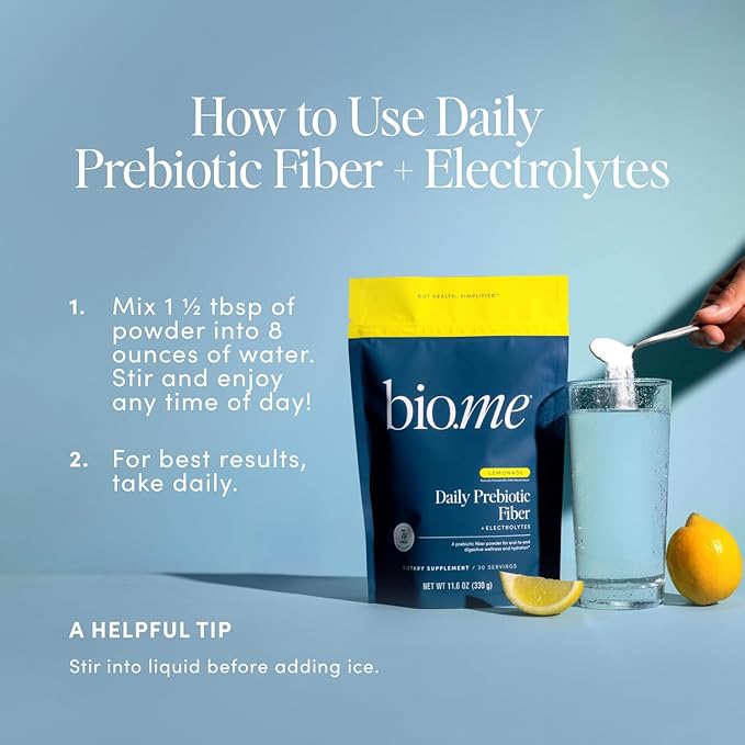 - VERSATILE AND CONVENIENT: Incorporating fiber into your diet has never been easier. Bio.me's prebiotic fiber powder is incredibly versatile, seamlessly mixing into warm and cold water and smoothies. This lemonade flavored dietary fiber supplement is perfect for daily use, making sure you get the digestive health support you need effortlessly.