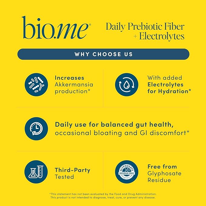 - DIGESTIVE SUPPORT: Take good care of your digestive health with Bio.me Daily Prebiotic Fiber supplement. This fiber powder combines two clinically-researched prebiotics, delivering 7g of soluble fiber per serving to support a balanced microbiome without causing bloating, gas, or cramping. This fiber supplement powder is perfect for both men and women and ensures gentle, effective relief when used daily.