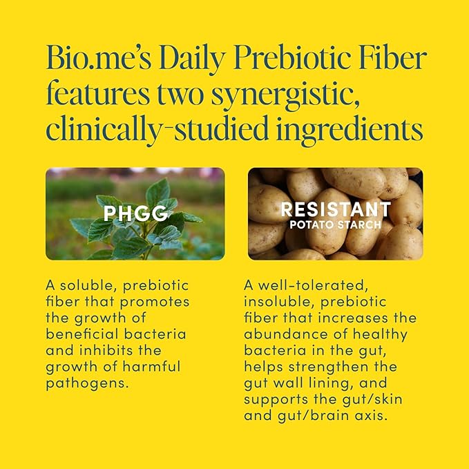 - BETTER GUT HEALTH: Bio.me's fiber powder is a unique blend of plant-derived resistant potato starch and hydrolyzed guar gum (PHGG), specifically formulated to boost your gut health. These prebiotics help promote the growth of beneficial bacteria, improve nutrient absorption, and support a healthy gut lining. Ideal as a daily use fiber supplement for women and men, it’s your partner in achieving optimal digestive wellness.